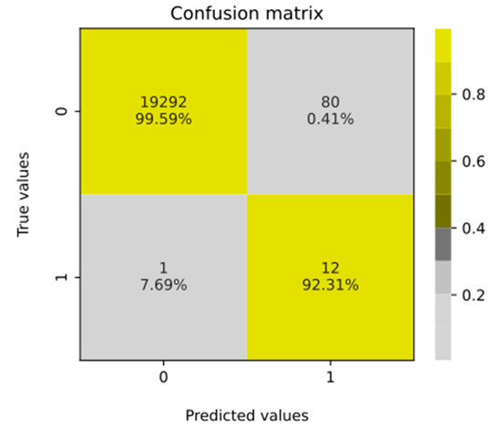 As mentioned, there were 92 patients with the risk factor ≥4. Among them, 80 patients were classified as FP and 12 were TP, which gave the ratio 1:7, while in the general population it is known to be 1:40,000 [1]. The obtained 1:7 ratio is 5714 times higher than the ratio represented within the general population. This represents significant knowledge gain. Next, a confusion matrix on all patients included in this study was prepared (Figure 6) to summarize the classification performance of the presented risk factor scoring for the cut-off set to 4. That evaluation helped to select patients who disagreed with the original class. The only FN patient known to have FD was confirmed to have a very general description in the EHR (as already mentioned). The returned confusion matrix (Figure 6) indicated an accuracy of 0.996, with sensitivity = 92.3% and specificity = 99.59%. However, due to the high class imbalance, precision = 0.1304, area under the precision–recall curve = 0.537 and F1-score = 0.2286 were found to be much more informative metrics. The obtained recall value supported the project’s assumptions. The low value of precision was anticipated, as from the beginning, it was assumed that some FD patients could be present in the control group. The high AUC value of 0.998 confirmed that the applied risk factor scoring and assigned cut-off point enabled accurate distinction between patient groups with a high discrimination power.