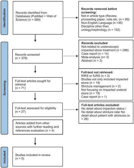 Case reports, case series, review articles, letters to editors, and articles not pertaining to ureteral strictures following impacted ureteral stone treatment were excluded from the study by titles, abstracts, and full-text screening.