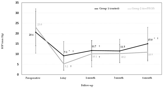 Measurement of intraocular pressure after surgery. *: Differences between groups at the follow-up visit. †: Differences with previous visit within the group. is-ePRGF: immunosafe eye drops plasma rich in growth factors; IOP: intraocular pressure.
