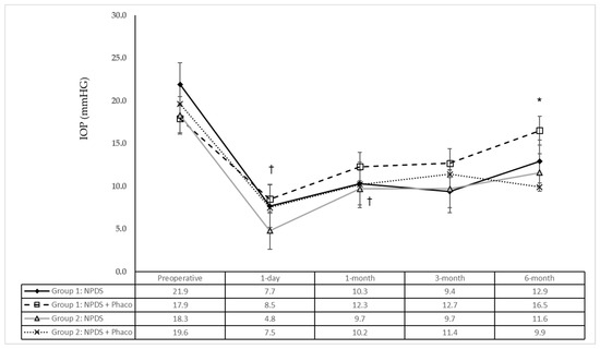 Measurement of intraocular pressure after surgery. *: Differences between groups at the follow-up visit. †: Differences with previous visit within the group. IOP: intraocular pressure; NPDS: non-penetrating deep sclerectomy; Phaco: phacoemulsification and intraocular lens implantation.