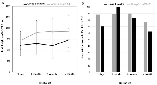 Measurement of bleb with AS-OCT. (A) Bleb height; (B) frequency of microcysts. is-ePRGF: immunosafe eye drops plasma rich in growth factors.
