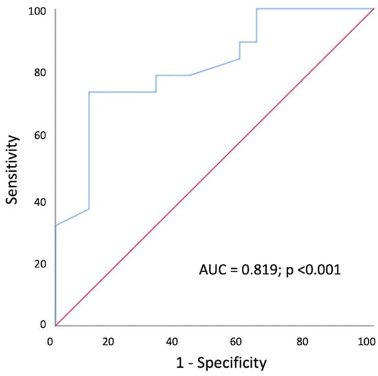 Moreover, a trend towards an increase in tricuspid valve velocity (2.36 ± 0.32 vs. 2.15 ± 0.33 m/s, p = 0.073) and tricuspid regurgitation gradient (22.7 ± 5.7 vs. 18.8 ± 6 mmHg, p = 0.060) was observed in the PE+ group, together with a slight, insignificant reduction in RVOT acceleration time (95.9 ± 18.8 vs. 109.2 ± 26 msec, p = 0.07) (Table 3). According to the ROC-curve analysis (Figure 2) RV-FWLS < 21% was the best cut-off with which to predict PE diagnosis in patients after SARS-CoV-2 pneumonia (sensitivity 74%, specificity 89%, area under the curve = 0.819, p < 0.001).