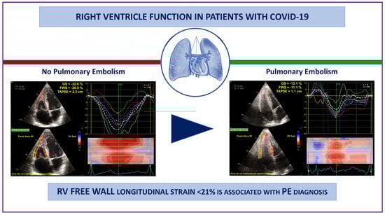 Coronavirus disease-2019 (COVID-19) is a systemic viral infection caused by severe acute respiratory syndrome coronavirus 2 (SARS-CoV-2), with a predominantly respiratory clinical presentation, and associated with multi-organ complications. Cardiac involvement has been frequently described, both as the effect of direct infection and because of increased pulmonary resistance due to acute respiratory distress syndrome (ARDS) and pulmonary embolism (PE) [,]. Pulmonary embolism imposes a pressure overload on the right-heart chambers, leading to progressive right ventricle (RV) dilation and dysfunction []. Echocardiographic evidence of adverse RV remodeling in the acute phase of COVID-19 pneumonia has been extensively described and associated with early mortality, independently of clinical and biomarker risk stratification []. In this context, two-dimensional (2D) speckle-tracking derived RV longitudinal strain was shown to be more effective than conventional echocardiographic parameters in detecting early and subclinical signs of RV dysfunction, as well as providing additional predictive value []. However, to date, little is known about the persistence of myocardial injury in recovered COVID-19 patients, with or without a previous diagnosis of PE. The aim of the present study is to evaluate the presence of echocardiographic signs of myocardial dysfunction in COVID-19-pneumonia survivors at one year of follow-up, according to their positive/negative clinical history of PE.