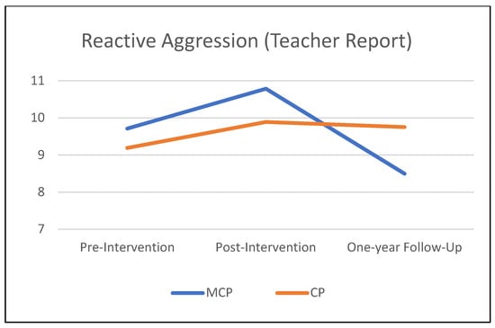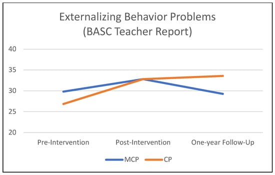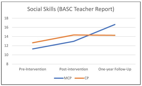 Table 3 summarizes the results of the mixed-effects models comparing the MCP and CP interventions on teacher-rated child behavioral outcomes from pre-intervention to the one-year follow-up. Figure 1, Figure 2 and Figure 3 illustrate these findings. A significant time × condition effect indicated that MCP produced significantly stronger improvement than CP in children’s social skills (p = 0.037). The time × condition effect was marginally significant for reactive aggression (p = 0.057), with more improvement in the MCP group than in the CP group. Children in the MCP group showed a significant increase in social skills (p < 0.01) on average, and a marginally significant decrease in reactive aggression (p = 0.055). Meanwhile, the average change in the CP group was non-significant for both social skills and reactive aggression (p > 0.20). Children in the CP group showed a significant worsening of externalizing problems (p =.041) on average, while the change in the MCP group was non-significant (p = 0.884). However, the time × condition interaction did not attain statistical significance at 5% for externalizing problems (p = 0.109). In terms of proactive aggression, children in the MCP group showed a significant decline (p =.002) on average, while the change in the CP group was non-significant (p = 0.120). The time × condition interaction, however, did not attain statistical significance for proactive aggression (p = 0.294).
