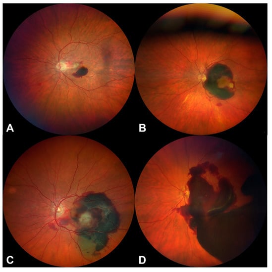 Examples for the classification of the size of macular hemorrhages. (A): Small-sized macular hemorrhage (SMH ≤ 4 disc diameters), (B): Medium-sized macular hemorrhage (SMH > 4 disc diameters, not extending beyond the vascular arcades), (C): Large-sized macular hemorrhage (SMH extends beyond the temporal vascular arcades, but not past the equator), (D): Massive sized macular hemorrhage (SHM extends past the equator in at least two quadrants); (A,B): Group 1, (C,D): Group 2.