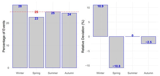 Variations in the incidence of macular hemorrhages in the study population by season. December, January, and February were defined as Winter, March, April, and May as Spring, June, July and August as Summer, September, October and November as Autumn. The red line resembles the expected value under uniform distribution.