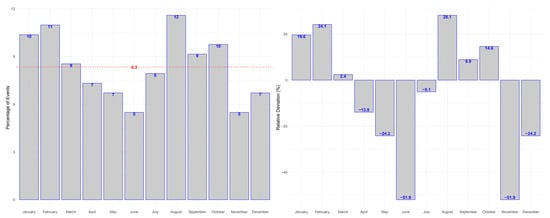Variations in the incidence of macular hemorrhages in the study population by month. The red line resembles the expected value under uniform distribution.
