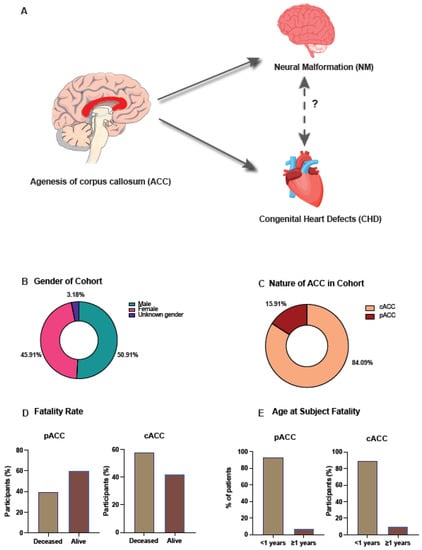 Graphical abstract and graphs depicting the demographics of study participants. (A) One of the aims of the study was to analyse whether there is an association between neural malformations (NM) and congenital heart defects (CHD) amongst those diagnosed with agenesis of the corpus callosum (ACC) as associations between ACC and NM and ACC and CHD have already been established. (B) Raw data from 220 patients with ACC provided by Public Health Wales was filtered and the data shows that 45.91% (n = 101) of those with ACC between 1998–2020 were female, 50.91% (n = 112) were male and 3.18% (n = 7) had unknown gender due to either foetal loss or termination of the pregnancy occurring before gender could be determined. (C) The ACC morphology of the cohort was determined with 84.09% (n = 185) showing complete ACC (cACC) and 15.91% (n = 35) showing partial ACC (pACC). (D) The fatality rate of the cohort was calculated and subsequently broken down to show the rate of fatality within each ACC morphology group. Of those with pACC 40% (n = 14) had passed away when the study was conducted and 60% (n = 21) were alive. In contrast, of those with cACC 57.84% (n = 107) had passed away and 42.16% (n = 78) were alive. (E) To further understand the demographics surrounding fatality of individuals with ACC the age at which the participant died was explored. 92.86% (n = 13) of those diagnosed with pACC died at <1 year of age. Similarly, 89.72% (n = 96) of the cACC cohort who had passed away died at <1 year of age.