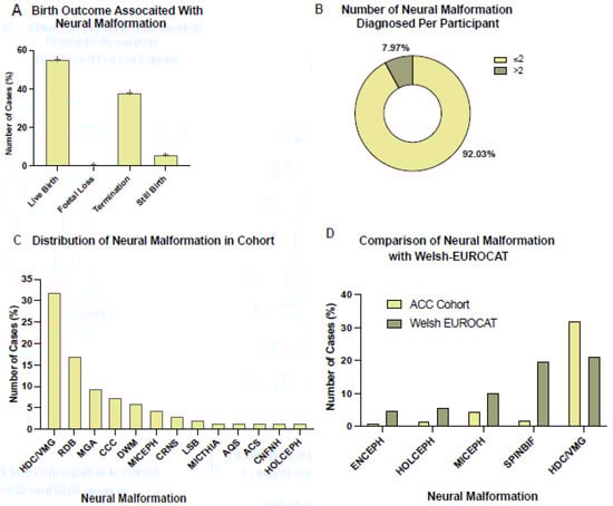 Graphs depicting the demographics of those with ACC that also had neural malformation (NM) diagnoses. (A) The birth outcome of those with ACC and NM (n = 138) was explored to investigate whether having an NM diagnosis in addition to the ACC diagnosis affected birth outcome. The data shows that live birth was the most common outcome for this cohort (55.8%, n = 77), followed by termination of pregnancy (37.68%, n = 52), then stillbirth (5.8%, n = 8) and lastly foetal loss (0.72%, n = 1). (B) The pie chart shows the demographics of NM diagnosis in this study’s cohort. 92.03% (n = 127) had two or less NM diagnoses, whilst 7.97% (n = 11) had more than two NM diagnoses. (C) The bar chart is showing which NM diagnoses were identified in this cohort and how prevalent they were amongst this cohort. Ventriculomegaly/hydrocephalus (HDC/VMG) (26.37%, n = 53) was the most common NM, followed by reduction deformities of the brain (ROB) (16.92%, n = 34), microgyria (MGA) (9.45%, n = 19), congenital cerebral cysts (CCC) (7.46%, n = 15), and Dandy–Walker malformation (DWM) (5.47%, n = 11). Other NM diagnoses were colpocephaly (COLCEPH) (5.47%, n = 11), microcephaly (MICEPH) (4.48%, n = 9), craniosynostosis (CRNS) (2.99%, n = 6), lumbar spina bifida (LSB) (1.99%, n = 4), micrognathia (MICTHIA) (1.49%, n = 3), aqueduct Stenosis (AQS) (1.49%, n = 3), Arnold–Chiari syndrome (ACS) (1.49%, n = 3), congenital malformation of face and neck, unspecified (CNFNH) (1.49%, n = 3) and holoprosencephaly (HOLCEPH) (1.49%, n = 3). (D) To understand whether NM occurred more or less frequently among those with ACC compared to those with ACC, the prevalence of NM among this cohort was compared to data from EUROCAT (European network of population-based registries for the epidemiological surveillance of congenital anomalies). This analysis showed that this cohort of individuals with ACC had a 3.56% higher prevalence of HDC/VMG than the EUROCAT cohort although this was not statistically significant. Spinal bifida (SPINBIF) (p = 4 × 10−6), microcephaly (MICEPH) (p = 0.0036), holoprosencephaly (HOLOCEPH) (p = 0.0055), and encephalocele (ENCEPH) (p = 0.0069) prevalence was significantly higher in the EUROCAT population.