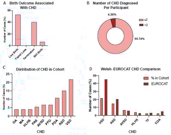 Graphs depicting the demographics of those with ACC that also had congenital heart defects (CHD) diagnoses. (A) The birth outcome of those with ACC and CHD (n = 47) was explored to investigate whether having a CHD diagnosis in addition to the ACC diagnosis affected birth outcome. The data shows that live birth was the most common outcome for this cohort (53.19%, n = 25), followed by termination of pregnancy (40.43%, n = 19), then stillbirth (6.38%, n = 3) and lastly foetal loss (0%, n = 0). (B) The pie chart shows the demographics of CHD diagnosis in this study’s cohort. 95.74% (n = 45) had less than or two NM diagnoses, whilst 4.26% (n = 2) had more than two CHD diagnoses. (C) The bar chart is showing which CHD diagnoses were made in this cohort and how prevalent they were amongst this cohort. Ventricular septal defect (VSD) was the most common CHD (21.92%, n = 16), followed by atrial septal defect (ASD) (15.07%, n = 11), and patent ductus arteriosum (PDA) (10.96%, n = 8). Other CHD diagnoses were, patent foramen ovale (PFO) (6.85%, n = 5), atrioventricular septal defect (AVSD) (6.85%, n = 5), pulmonary artery stenosis (PAS) (5.48%, n = 4), hypoplastic left heart syndrome (HLHS) (4.11%, n = 3), malformation of aorta (MA) (4.11%, n = 3) and overriding aorta (OA) (4.11%, n = 3). (D) To understand whether CHD occurred more or less frequently among those with ACC compared to those with ACC, the prevalence of CHD among this cohort was compared to data from EUROCAT (European network of population-based registries for the epidemiological surveillance of congenital anomalies). This analysis showed that the EUROCAT cohort had a significantly greater prevalence of VSD compared to our cohort (p = 4.7 × 10−5). Although, our cohort did have a significantly greater prevalence of PDA compared to EUROCAT data (p = 0.011). The CHDs compared were, ventricular septal defect (VSD), atrial septal defect (ASD), Atrioventricular Septal Defect (AVSD), Hypoplastic Left Heart Syndrome (HLHS), Tetralogy of Fallot (TF) and Coarctation of Aorta (COA).