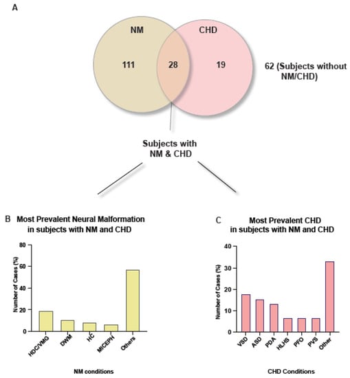 Within the cohort, 57.14% had been diagnosed with <2 NM whilst 60.71% of the cohort had ≥2 CHD. Within this, HDC/VMG was the most prevalent NM (17.02%, n = 8) (Figure 4B) and ventral septal defects (17.78%, n = 8) was the most prevalent CHD (Figure 4C). As NM and CHD are observed together in 12.7% of our cohort, we wanted to determine whether there is a statistically significant association between the presence of NM and CHD; however, no statistically significant association between NM and CHD diagnosis was found, χ2 (1, n = 220) = 3.84, p = 0.33.