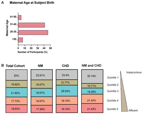 Maternal age at subject birth and socioeconomic background demographics. (A) One of the aims was the investigate whether maternal age is a risk factor for an individual developing ACC. As such maternal age at subject birth was explored, and the bar chart shows that the 20–30 years of age range was the most common maternal age during birth, 46.36% (n = 102), closely followed by the 31–40 years range, 41.36% (n = 91), then <20 years of age, 7.27% (n = 16) and finally 41–50 years of age, 5% (n = 11). (B) To further explore potential risk factors for developing ACC the WIMD 2019 quintiles of deprivation were analysed to determine if the socioeconomic background of the participants mother is associated with the development of ACC and other co-morbidities. Quintile 1, the most deprived quintile, was the most observed quintile in the total cohort (25%, n = 55), only NM diagnosed cohort (23.91%, n = 33), and both NM and CHD cohort (32.14%, n = 9). A chi-squared test was also conducted to determine if there is a statistically significant association between the co-morbidities diagnosed (i.e., only NM, only CHD and, NM and CHD) and the WIMD 2019 quintile. No statistically significant association (p = 0.45) was found between the deprivation quintiles and the co-morbidities diagnosed.