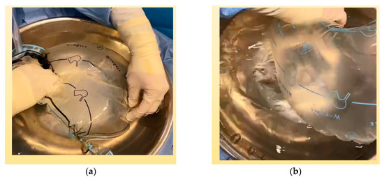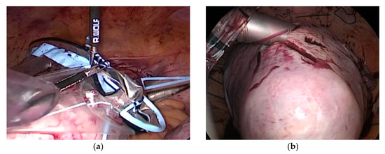 Visibility of a medical thermoplastic polyurethane surgical bag during morcellation of a giant myoma (2800 g): (a) closing the large bag; (b) initial morcellation.