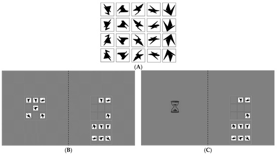 Participants were instructed to copy a model puzzle of 6 items in a 3 × 3 ‘example’ grid on the left side of the screen to a 3 × 3 empty grid on the right side of the screen. Participants used a computer mouse with their preferred hand to drag one of the six items from the right bottom of the screen (the ‘resource’ grid) to the correct cell in the empty grid. The items were adopted from Arnoult [27] (Figure 1A) and consisted of black geometrical shapes that could not easily be named to measure reliance on VWM instead of verbalisation strategies [10].