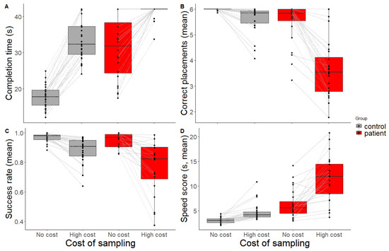 Performance scores. (A) Completion time (Mdn, 42s time limit). When introducing a high-cost gaze-contingent waiting time, patients failed to complete the puzzle within the time limit. (B) Mean correct placements (maximum 6) per trial, (C) mean success rate, and (D) mean speed score for controls (grey) and patients (red) across conditions (no-cost, high-cost). Black dots and grey lines represent scores for individual participants.