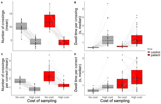 Eye movement measures as indicator for sampling behaviour. (A) Mean number of crossings within a trial, (B) median dwell time per crossing, (C) mean number of crossings needed to make one correct placement, and (D) median dwell time needed to make one correct placement for controls (grey) and patients (red) across conditions (no-cost, high-cost). Black dots and grey lines represent outcomes of individual participants.
