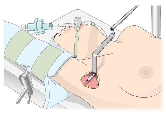 The surgical procedure for RATT includes chest skin flap elevation by using an external retractor system to form a working space [6,8,9] (Figure 1). During this procedure, significant pressure is applied to the skin flap, and this pressure is presumably associated with postoperative pain and sensory changes [5,10]. Assuming that complete muscle relaxation could enhance visualization and reduce the retractor pressure required for skin flap elevation, deep neuromuscular block (NMB) may help reduce postoperative pain and sensory changes. In laparoscopic abdominal surgery, deep NMB has been demonstrated to mitigate postoperative pain and improve surgical conditions [11,12,13]. Nevertheless, its effect on RATT remains unknown. Therefore, we scrutinized the effect of deep NMB during RATT on postoperative pain and sensory changes. We hypothesized that deep NMB reduces postoperative pain and sensory changes after RATT.