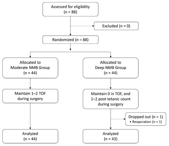 In total, 88 patients were enrolled in the current study, and the patients were evenly allocated to the moderate NMB group (n = 44) or the deep NMB group (n = 44). Two cases of postoperative bleeding occurred in the deep NMB group; one of them underwent reoperation and was dropped from the study, and the other patient received only conservative management and was included in the analysis. Finally, 87 patients were included in the analysis (Figure 2). There were no missing values in the hospitalization data; however, data for POD 90 had missing values in 18 patients.