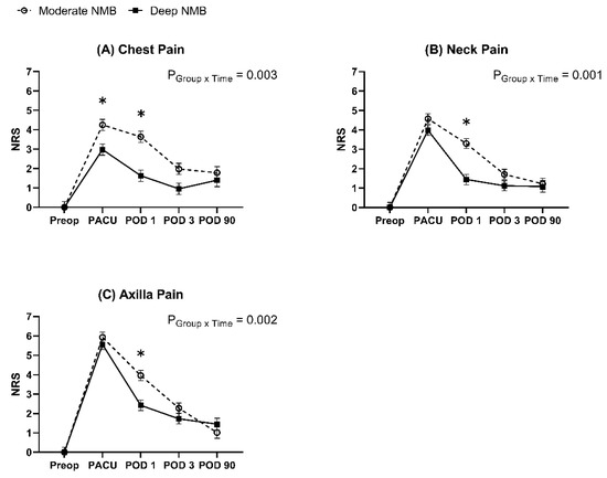 The linear mixed models for NRS pain scores in the chest, neck, and axilla all showed significant intergroup differences over time (p = 0.003 in the chest; p = 0.001 in the neck; p = 0.002 in the axilla). Post hoc analysis with Bonferroni correction revealed that the NRS pain scores of the chest, neck, and axilla on POD 1 were significantly lower in the deep NMB group compared to those in the moderate NMB group (3.6 vs. 1.6 in chest, adjusted p < 0.001; 3.3 vs. 1.4 in neck, adjusted p < 0.001; 4.0 vs. 2.4 in axilla, adjusted p < 0.001) (Figure 3).