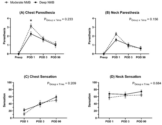 The linear mixed models for paresthesia scores and degree of remnant sensation did not show intergroup differences over time. Post hoc analysis revealed that the paresthesia score of the chest on POD 1 was significantly lower in the deep NMB group compared to that in the moderate NMB group. (3.1 vs. 2.3, adjusted p = 0.049) (Figure 4).