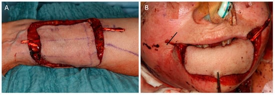 The reconstruction of total or near-total lip defects is very demanding, as functional lips are a prerequisite for proper eating, drinking, and speaking. Moreover, lips represent an esthetic key structure in the face. Partial lip defects are, depending on size, mainly reconstructed using local flaps such as Abbé and Karapandzic or Johnson’s stair step technique, which at least partly restore orbicularis oris muscle function, thereby maintaining functional lip movement [5,6]. Subtotal or total defects, however, may not be restorable by local techniques, as mouth opening becomes too restricted, requiring free flap reconstruction [7].