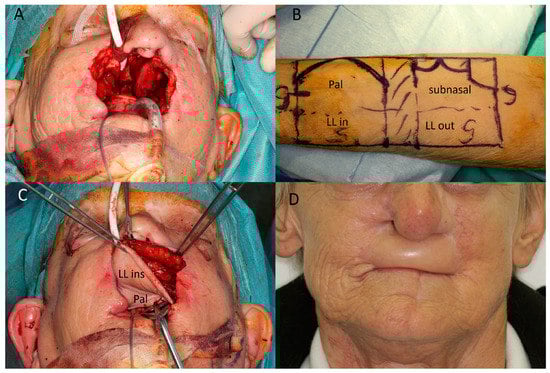 (Case 6) Lip and maxillary reconstruction. (A) Extensive resection of a basal cell carcinoma including anterior maxilla, upper lip, and nasal base. (B) Design of the radial forearm flap (RFF), overall 12 × 6 cm. Palatinal (pal). Lower lip (LL). Outside (out). Inside (in) (C) Inset of RFF with reconstruction of lip, anterior maxilla, and palate. (D) Post-op situation after 18 months. Recurrence at right ala was successfully treated with Vismodegib.