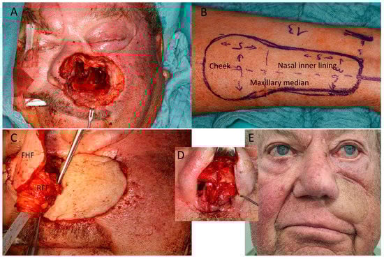 (Case 11) Mid face/nasal reconstruction after recurrent squamous cell carcinoma (SCC) of the left cheek and nose. (A) Defect including anterior septal base, left nasal ala, and anterior and median walls of maxillary sinus. (B) Design of the radial forearm flap (RFF), overall 13 × 6 cm. The width was 6 cm proximally and 3.5 cm distally (C) Inset of proximal RFF for cheek reconstruction; median RFF goes down to median wall of maxillary sinus. A titanium mesh restores the facial wall of the maxillary sinus. Turnover of distal RFF for nasal lining and suturing to split RFF edge as lateral nasal ala. Simultaneous forehead flap (FHF) due shortage of surgical capacities because of COVID-19 situation. (D) Reconstruction of left ala with ear cartilage 4 weeks later. (E) Appearance 15 months after alar cartilage framework and 12 months after radiotherapy.