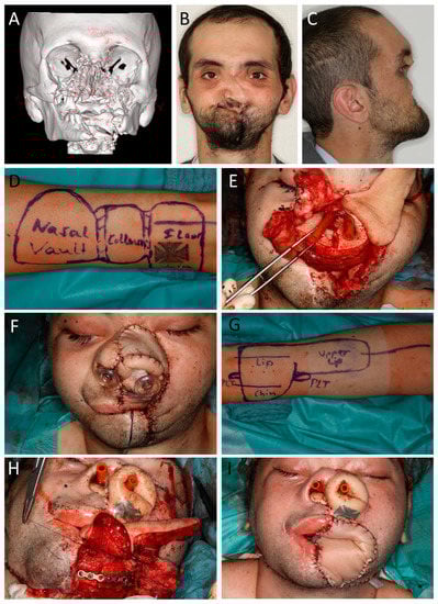 (Case 12) Mid and lower face reconstruction after avulsive gunshot injury. Patient initially showed up with tracheostomy and percutaneous gastral feeding tube. Additionally, he had a 4MRGN with pseudomonas aeruginosa, Citrobacter freundii, Klebsiella pneumoniae, and Staphylococcus aureus. Four surgeries were performed. Amoxicillin/Clavulanic acid was used for prophylaxis. (A) CT reconstruction shows the extensive destruction of the mid and lower face. (B,C) Pre-surgical view with missing mid face and no mouth opening. (D) Marking of the 14 × 6 cm2 radial forearm flap (RFF) from left arm for lining of nasal vault, columella, and upper lip (L out). (E) Inset of a free fibula flap (FFF) from the right leg with the skin island reconstructing the nasal floor and RFF starting laterally. The FFF skin paddle was split for columella lining and adaption with RFF. Both RFF and FFF were anastomosed to superficial temporal vessels (FFF right; RFF left). (F) End of first surgery with free skin graft on 360°-folded RFF for inner nasal lining and upper lip reconstruction. (G) Second surgery for reconstruction of the mandible and lip/commissure, restoring mouth opening. Marking of 7 × 14 cm2 RFF from right arm with palmaris longus tendon (PLT). (H) Inset of a FFF from the left leg. The skin paddle restores the anterior floor of mouth. Inset of the RFF with lining of the mucosal side first and suturing of the palmaris longus tendon to the remnant lower-right orbicularis oris and left zygomatic major muscle. Both free flaps were anastomized to the right and left facial arteries and veins. (I) End of surgery two.
