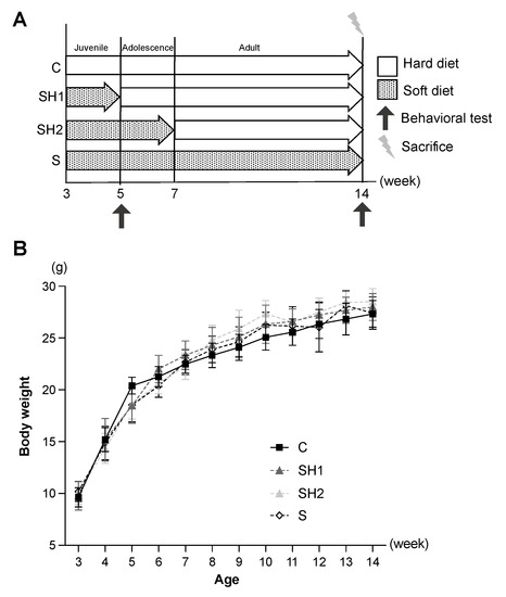 Experimental time points and body weight changes during the study period. (A) Timeline of the study period. (B) Whole body weight changes from weaning age to sacrifice time in all groups. No significant differences were observed among the four groups (n = 25 per group). Error bars denote the mean ± standard error. Abbreviations: C, control group; SH1, Soft–Hard Diet 1 group; SH2, Soft–Hard Diet 2 group; and S, Soft Diet group.