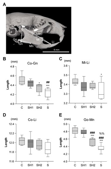 No significant differences were noted in the body weights among the groups at any point during the experimental period (Figure 1B). Shape changes associated with the soft diet were observed in the vertical and anteroposterior dimensions of the mandible (Figure 3B–E). The mandible heights (Co-Gn) were significantly decreased in the SH2 (4.343 ± 0.10 mm, p-value < 0.05 vs. the C group) and S (4.25 ± 0.10 mm, p-value < 0.001 vs. the C group) groups compared to that in the C group (4.51 ± 0.11 mm). The most obvious difference was noted in the posterior lengths of the mandibles (Go-Mn) in the SH2 (4.55 ± 0.10 mm, p-value < 0.001 vs. the C group) and S groups (4.35 ± 0.10 mm, p-value < 0.001 vs. the C group). The anterior length of the mandible (Mi-Li) was only significantly different between the S (3.33 ± 0.10 mm, p-value < 0.05 vs. the C group) and C (3.43 ± 0.04 mm) groups.