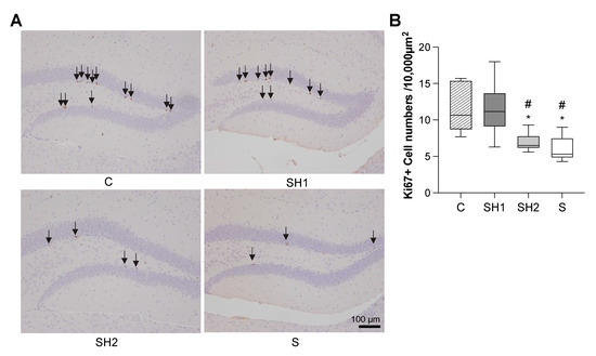 Nissl staining showed that the neurons were arranged in an orderly way in the hippocampi in the C and SH1 groups. In contrast, the neurons in the SH2 and S groups were scattered in a disorderly way (Figure 4A). Compared to the C group mice, the S group mice exhibited neuronal losses in both the CA1 and CA3 regions (p-value < 0.01 vs. the C group, respectively) (Figure 4B,C). Only the CA3 region in the SH1 group showed improvement in its neuron number (p-value < 0.05 vs. the S group) (Figure 4C). No significant neuronal differences were identified in the DG regions among the four groups (Figure 4D). Ki67, an endogenous cell-cycle protein commonly employed as a cellular proliferation marker and expressed during all active phases of the cell cycle, was used to examine whether the reductions in the neurons in the CA1 and CA3 regions were because of the impairment of neurogenesis. The number of Ki67+ cells was significantly reduced in both the SH2 (p-value < 0.05 vs. the C group and the SH1 group, respectively) and S groups (p-value < 0.05 vs. the C group and the SH1 group, respectively), indicating that the long-term soft diet greatly affected cellular proliferation (Figure 5).