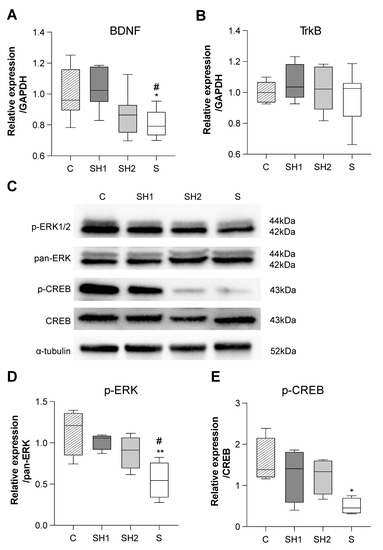 In the SH1 group, the BDNF mRNA expression (p-value <0.05 vs. the S group) and protein levels of the downstream factors p-ERK1/2 (p-value <0.05 vs. the S group) were significantly improved compared to those in the S group, indicating that most of the BDNF/TrkB/ERK/CREB pathway recovered from the short-term reduced masticatory activity associated with the soft diet (Figure 6). However, the SH2 group tended to show decreased BDNF mRNA and p-ERK1/2 and p-CREB protein levels, although these differences were not significant. These findings indicate that reliance on a soft diet progressively infringed upon the activity of the BDNF/TrkB/ERK/CREB pathway. Finally, the BDNF receptor, TrkB (encoded by Ntrk2), did not exhibit significant differences among the four groups (Figure 6B).