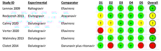 Figure 2. RoB2 assessment of included randomized controlled trials. RoB2 domains: D1: randomization process; D2: deviations from intended interventions; D3: missing outcome data; D4: measurement of outcome; D5: selection of the report result. Red (-) describes a high risk of bias; yellow (!) describes some concerns about bias; and green (+) describes a low risk of bias.