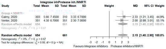Two RCTs reported variations in weight gain [26,27]. The use of INSTI increased weight by 2.15 kg (95% CI 1.40 to 2.90, I2 = 0%, moderate CoE; Figure 3 and Table S2).