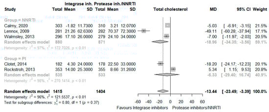 Figure 4. Effects of integrase inhibitors (Integrase inh.) on total cholesterol compared to control, stratified by type of control: protease inhibitors (Protease inh.) or NNRTI. Squares represent the mean difference (MD) of each individual RCT, horizontal lines represent the 95% confidence intervals (CI) of the MD, and diamonds are the MD of the random effects meta-analysis per stratum and overall.