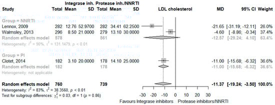 Figure 5. Effects of integrase inhibitors (Integrase inh.) on LDL cholesterol compared to control, stratified by type of control: protease inhibitors (Protease inh.) or NNRTI. Squares represent the mean difference (MD) of each individual RCT, horizontal lines represent the 95% confidence intervals (CI) of the MD, and diamonds are the MD of the random effects meta-analysis per stratum and overall.