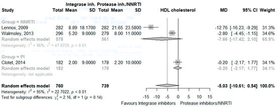 Figure 6. Effects of integrase inhibitors (Integrase inh.) on HDL cholesterol compared to control, stratified by type of control: protease inhibitors (Protease inh.) or NNRTI. Squares represent the mean difference (MD) of each individual RCT, horizontal lines represent the 95% confidence intervals (CI) of the MD, and diamonds are the MD of the random effects meta-analysis per stratum and overall.