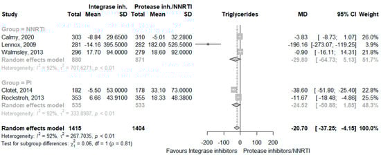 Figure 7. Effects of integrase inhibitors (Integrase inh.) on triglycerides compared to control, stratified by type of control: protease inhibitors (Protease inh.) or NNRTI. Squares represent the mean difference (MD) of each individual RCT, horizontal lines represent the 95% confidence intervals (CI) of the MD, and diamonds are the MD of the random effects meta-analysis per stratum and overall.