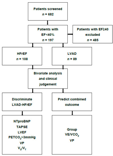 Flowchart of study inclusion. Combined outcome: composite of cardiovascular rehospitalization and mortality. EF: left ventricular ejection fraction. Group: patients with reduced left ventricular ejection fraction with and without a left ventricular assist device. HFrEF: heart failure with reduced ejection fraction (without left ventricular assist device support). LVAD: left ventricular assist device. NTproBNP: N-terminal prohormone of brain natriuretic peptide. PETCO2: endtidal carbon dioxide as a surrogate for alveolar perfusion. TAPSE: tricuspid annular plane systolic excursion. VD/VT: dead space ventilation during exercise. VE/VCO2: minute ventilation per carbon dioxide production. VP: ventilatory power (the ratio of peak systolic pressure and VE/VCO2).