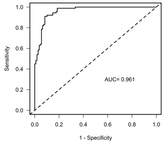 The overall discriminating power of the multivariable model using the ROCs was AUC = 0.96 (CI 0.94–0.99 R2 = 0.79, Figure 2).