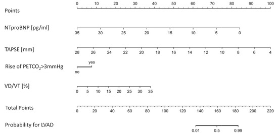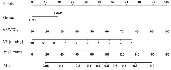 Our precise multicomponent prediction model (AUC = 96.1%) also included TAPSE, rather than LVEF, to discriminate between LVAD and HFrEF patients. This supports the existing literature as it has been previously shown that reduced right ventricular function is associated with postoperative morbidity in LVAD patients [26]. Future prediction models of cardiovascular morbidity in LVAD patients should also implement measures of preload assessment, such as an echocardiographic collapse of the vena cava before starting exercise testing. In our study LVEF did not play a pivotal role in determining morbidity or overall mortality. In summary, reduced TAPSE and higher VD/VT in LVAD patients may be the correlates of right ventricular–pulmonary artery uncoupling during exercise. Applying a nomogram for the risk to reach the composite outcome into clinical practice may be reasonable (Figure 5).