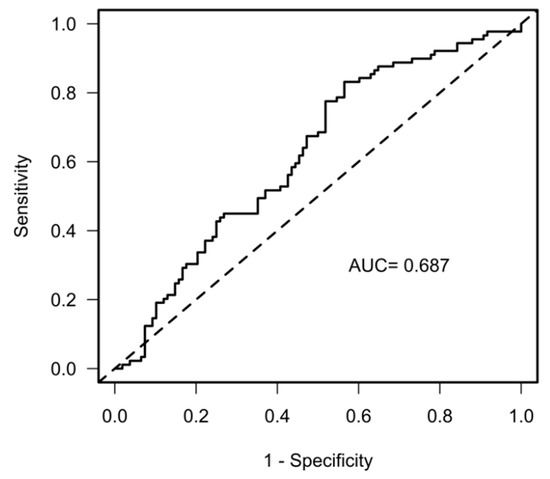 The predictive power of the multivariable model using the ROCs was AUC = 0.69 (CI 0.62–0.77, R2 = 0.16, Figure 4).