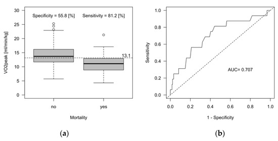 CPET variables were also included in a regression modeling step for overall mortality (Table A5), with only VO2peak showing a significant effect (p = 0.006, Figure 6a, Supplement 5). A VO2peak of 13.1 mL/min/kg demonstrated a specificity of 55.8% and a sensitivity of 81.2% in the entire population of patients (AUC = 0.707, Figure 6b).