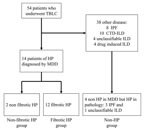 This retrospective cross-sectional study investigated 54 patients who underwent TBLC at our clinic between April 2020 and August 2021. Fourteen of the 54 patients were diagnosed with HP based on the official ATS/JRS/ALAT Clinical Practice Guideline [4]. In addition, we investigated 4 cases as non-HP group who diagnosed with fHP in pathology but not in MDD because of clinical feature, with no episodes of antigen inhalation, no lymphocytosis in BAL, and no effectiveness of antigen avoidance (Figure 1). For these 18 patients, patient background at diagnosis, blood test, pulmonary function test, and bronchoalveolar lavage fluid test results were collected from medical records. We also collected information on chest HRCT and histopathological findings as well as diagnoses of MDD made based on these findings.