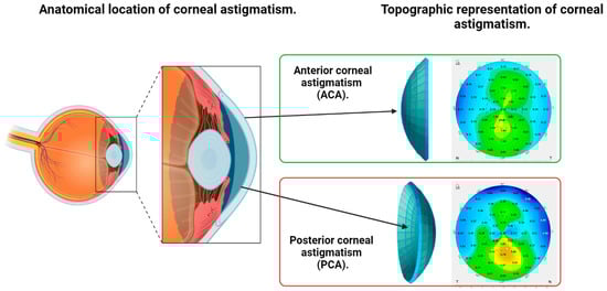 Corneal astigmatism correction is a key factor when planning refractive treatment for ametropies with intraocular lenses [1,2,3,4,5]. Anterior corneal astigmatism (ACA) is the main source of corneal astigmatism (Figure 1), but astigmatism arising from the posterior surface of the cornea (PCA), although usually small in magnitude, should also be taken into account to better estimate the real (total) corneal astigmatism [6,7,8,9,10,11,12,13].
