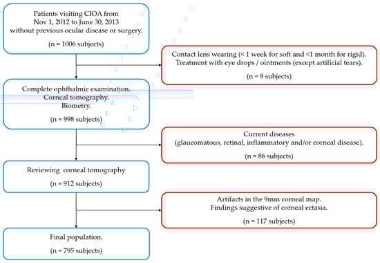The inclusion criteria were no history of ocular disease or surgery. The exclusion criteria were one or more of the following situations (Figure 2): contact lenses wearing close to the examination (less than 1 week for soft contact lenses and less than 1 month for rigid contact lenses), topical treatment (except for artificial tears) as wells as a glaucomatous, retinal, inflammatory and/or corneal disease (congenital or acquired) with a previous diagnosis or diagnosed during the examination. Tomographic exclusion criteria indicating a possible ectasia were also used: (a) asymmetric bow-tie pattern or abnormal steepening or skewed radial axis [28] or (b) the combination of a rate of progression of pachymetry (RPI) of more than 1.2 with a thinnest point less than 450 µm combined with a posterior elevation greater than 13.5 µm [29].