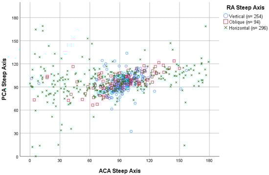 Steep axis orientation (vertical, oblique and horizontal) distribution was 254 (39.4%), 94 (14.6%) and 296 (46%) for RA; 584 (73.5%), 113 (14.2%) and 98 (12.3%) for ACA; and 742 (93.3%), 42 (5.3%) and 11 (1.4%) for PCA, respectively.