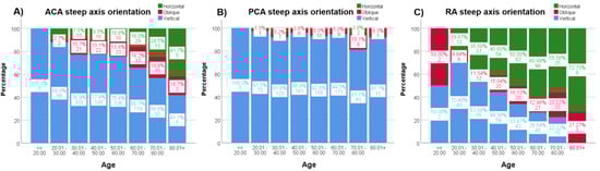 (A–C). Percentages of the steep axis distribution through decades for ACA (A), PCA (B) and RA (C). Each column shows the percentage (%) and the number of subjects for the three steep axis orientations (green = horizontal, red = oblique and blue = vertical) and for every column. ACA = anterior corneal astigmatism; PCA = posterior corneal astigmatism; RA = Refractive astigmatism.