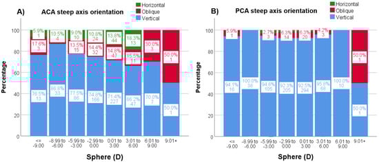 (A,B). Percentages (%) and n values of the steep axis distribution by sphere for ACA (A) and PCA (B). ACA = anterior corneal astigmatism; PCA = posterior corneal astigmatism.