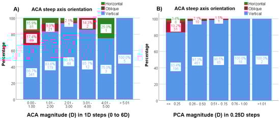 In addition, with increasing ACA magnitude, the frequency of vertical ACA steep axis orientation increased up to 3 D astigmatism (p < 0.001) but not for higher magnitudes (Figure 6A). Lastly, with increasing PCA magnitude, the frequency of PCA vertical steep axis orientation increased (p < 0.001) (Figure 6B).